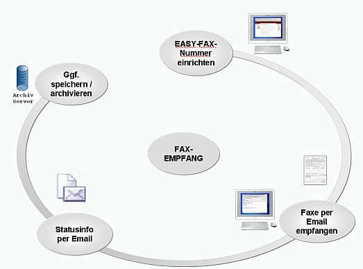 UPDATE Ab sofort bieten wir Ihnen zusätzlich die Möglichkeit, Faxe am PC zu empfangen. Hierfür stellen wir Ihnen eine Faxnummer aus dem Bereich 0180-EASYFAX bereit. Ihre Kunden bezahlen für den Versand eines Faxes an eine solche Nummer nur 0,09 Euro/min aus dem dt. Festnetz, ggf. abw. Mobilfunkpreise. An Ihre Faxnummer gesandte Faxe, stellen wir Ihnen als PDF per E-Mail zu, so dass Sie jederzeit und an jedem Ort über Ihre empfangenen Faxe informiert werden können.